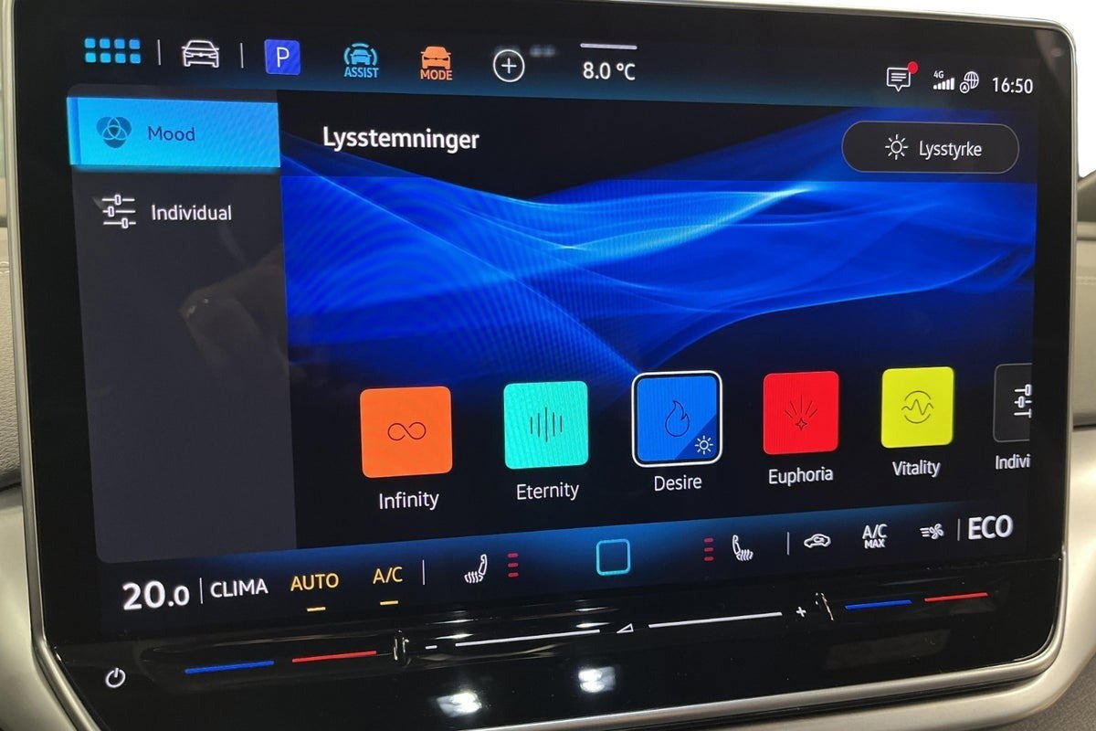 - Komfortpakke Climatronic klimaanlæg med 2 zoner og Air Care; Forrude opvarmelig, lyddæmpet og infrarød reflekterende, forsæder med indstillelig varme, 2 USB-C indgange for og 2 USB-C ladestik bag